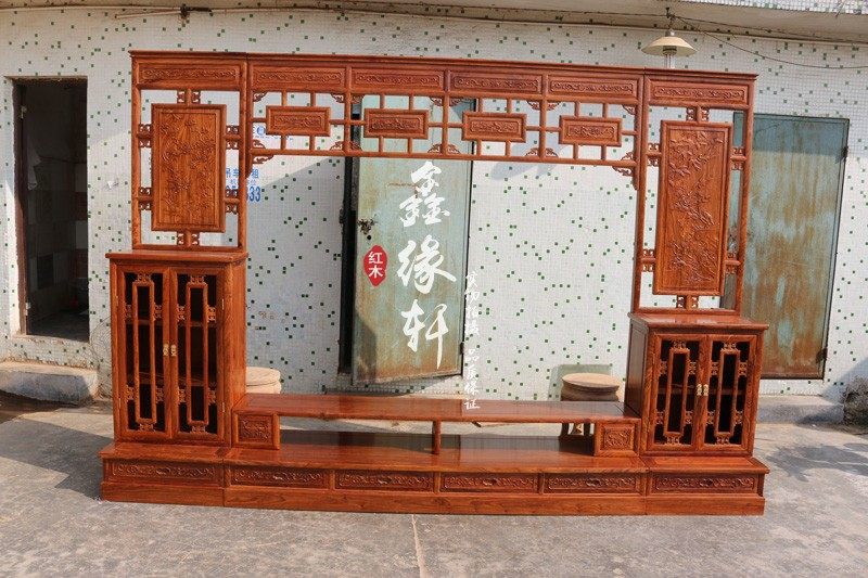 红木花梨木电视柜背景墙刺猬紫檀原木地柜实木储物架影视墙多宝阁热门设计联盟服务商